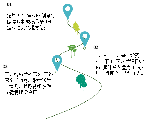 应用简介慢性肾衰竭指各种原发和继发的慢性肾脏疾病进行性恶化,逐渐出现肾功能不全发展到最终的统一性结局。目前这一概念在全球肾脏病界已被慢性肾脏病(CKD)所取代。将肾部分切除加对侧肾摘除法制作肾衰模型,存在手术复杂、制作困难、并发症多、死亡率高等缺点,而用腺嘌呤长期喂养大鼠建立慢性的肾衰模型,简单、易行,